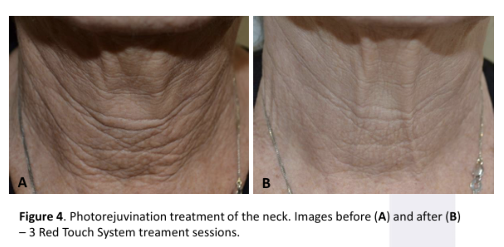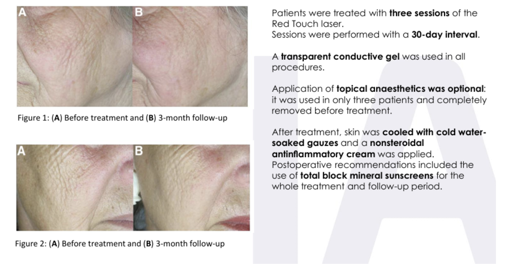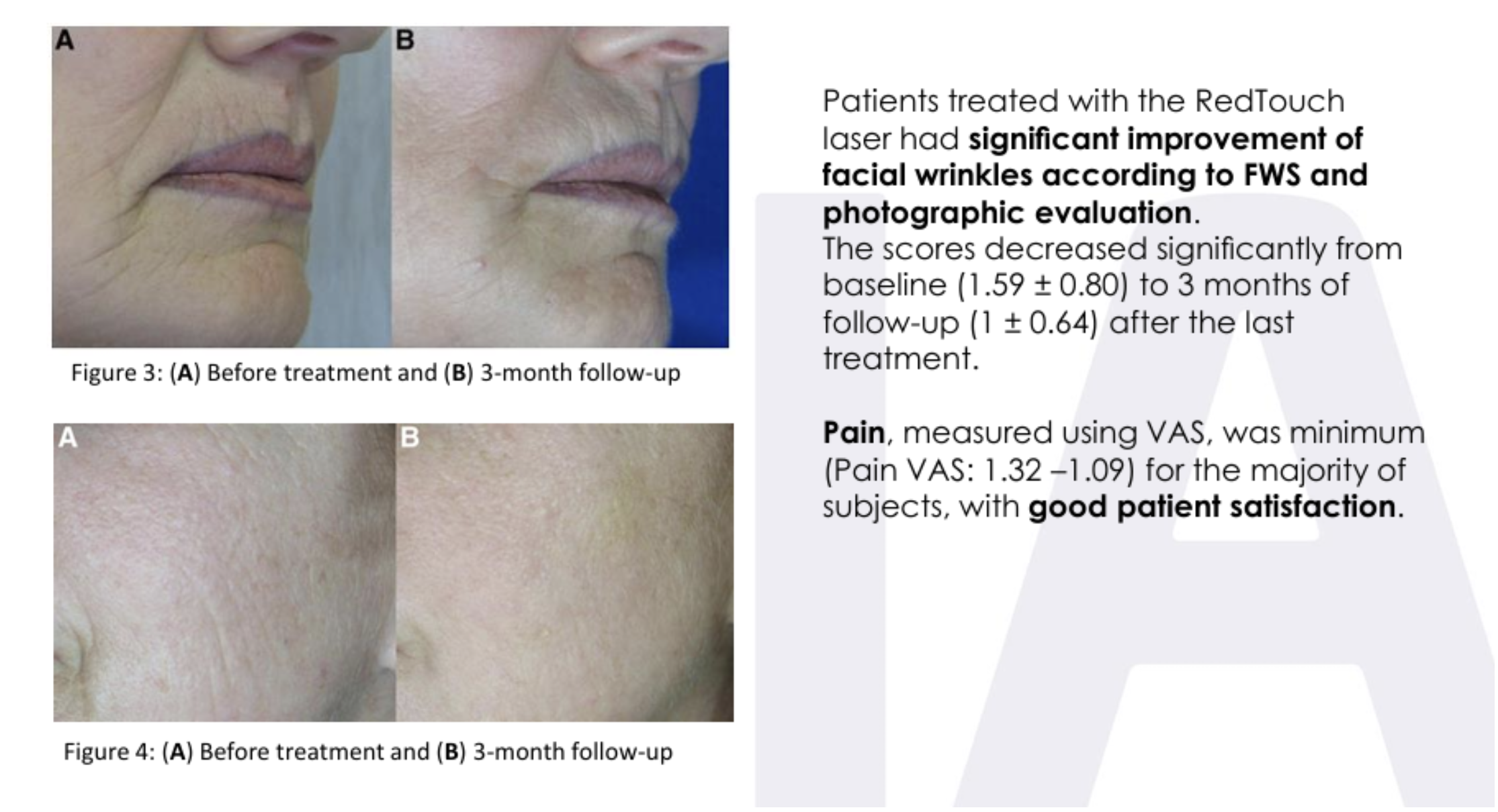 ผู้ป่วยที่ได้รับการรักษาด้วยเลเซอร์ RedTouch มีการปรับตัวดีขึ้นของริ้วรอยบนใบหน้าอย่างชัดเจน จากการประเมินด้วย FWS และการประเมินจากภาพถ่าย