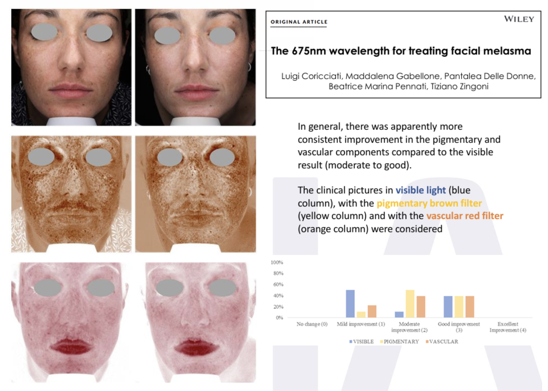 โดยภาพรวมแล้ว พบว่ามีการปรับตัวดีขึ้นอย่างสม่ำเสมอในส่วนของ เม็ดสีผิว (pigmentary component) และ เส้นเลือดฝอยใต้ผิว (vascular component) ซึ่งดูชัดเจนมากกว่าเมื่อเทียบกับผลลัพธ์ที่มองเห็นด้วยตาเปล่า (อยู่ในระดับปานกลางถึงดี)